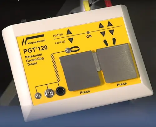 The PGT 2000 is a test instrument for measuring personnel grounding with user's identification and test values documentation. User's identification is performed with an ID module on the right shoe and/or transponder card.