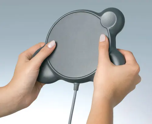 An enclosure that can be held and operated with two hands. Two-part enclosure design with symmetrically positioned gripping areas. Recessed surface for membrane keyboards. Separate recess for special functions. Attachment domes for a PCB in the top part.