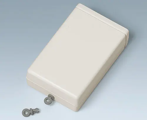 SENSO-CASE M Ergonomic plastic enclosure for single-handed operation. Recessed control panel for operating elements or display modules. Fastening pillars for PCBs in the top part. Space for 9 V flat battery or battery compartment 2 x AA (accessory). Cable strain relief (acc.) alternatively applicable.