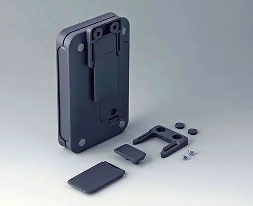 Serves as a clip and / or wall suspension. Assembly oriented towards the length or width (size S towards the length only). For a battery exchange, the clip can easily be removed. Two mounting holes diameter 4.2 mm necessary.