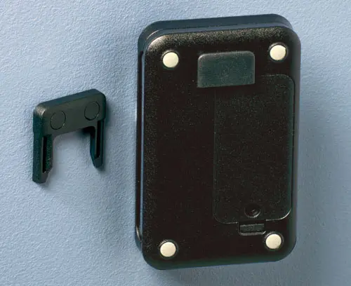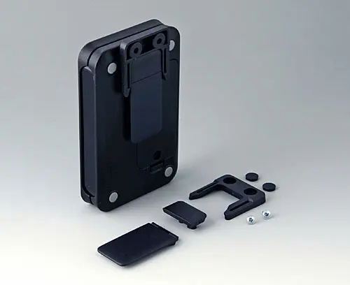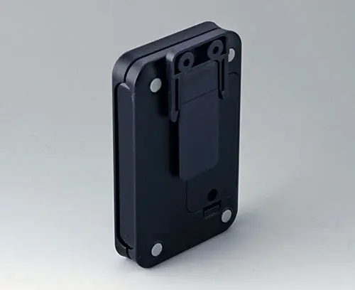 Serves as a clip and / or wall suspension. Assembly oriented towards the length or width (size S towards the length only). For a battery exchange, the clip can easily be removed. Two mounting holes diameter 4.2 mm necessary.