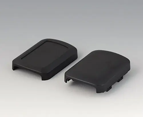 Basic enclosure, 2-piece, with convex and flattened shell. Recessed surface to protect the membrane keyboard, decor foil or label. Both end sides open, and end parts or the cable gland kits can optionally be mounted there (accessories). Four attachment domes for mounting a PCB in the flattened shell. Plastic enclosure snaps together.