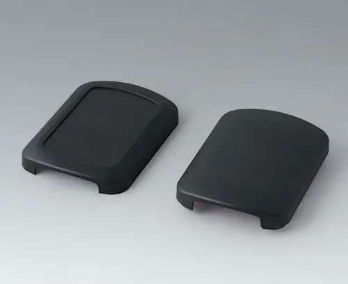 Basic enclosure, 2-piece, with convex and flattened shell. Recessed surface to protect the membrane keyboard, decor foil or label. Both end sides open, and end parts or the cable gland kits can optionally be mounted there (accessories). Four attachment domes for mounting a PCB in the flattened shell. Plastic enclosure snaps together.