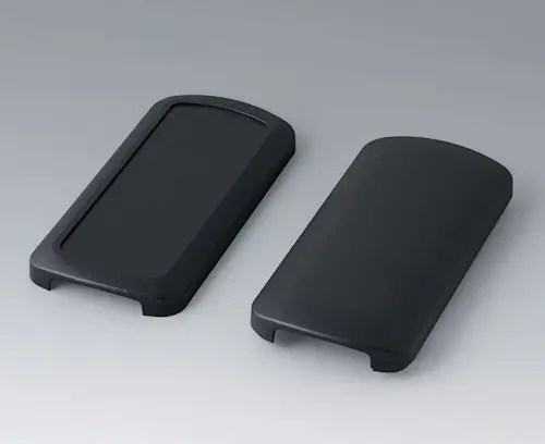 Basic enclosure, 2-piece, with convex and flattened shell. Recessed surface to protect the membrane keyboard, decor foil or label. Both end sides open, and end parts or the cable gland kits can optionally be mounted there (accessories). Four attachment domes for mounting a PCB in the flattened shell. Plastic enclosure snaps together.