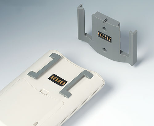 Mounting plates for contacts Universal accessories that simplify the assembly of contacts for transferring data and charging current between enclosures and stations. Available as a kit consisting of two plastic mounting plates for holding the 6-pin contacts which are available as accessories ("female" contact for the enclosure and "male" contact for the station).