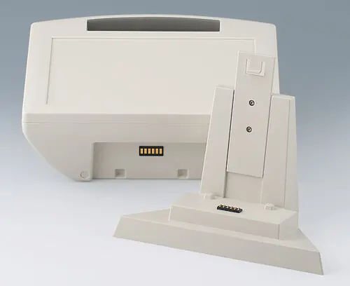 CARRYTEC L Robust plastic enclosure with handle. Recessed surface for membrane keyboards. Flat, impact-protected areas on the bottom part of the enclosure for installing interfaces, plug-in connectors, peripheral equipment etc. Interface installation at the rear, e.g. support arm applications, ensures orderly cable routing through enclosure connection, mounting points match the hole patterns of VESA MIS-D 100. Attachment domes for PCBs and components in the top and bottom parts. Stations for easy transmission of data and charging current, as well as battery compartment 5 x AA (processing on request) as an accessory.
