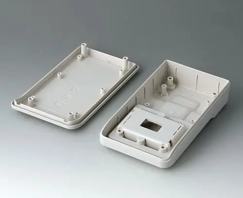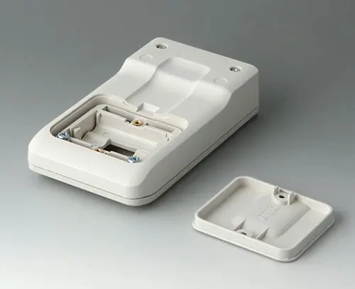 3-part compact hand-held enclosure with an ergonomic, robust design. Ideal for miniaturised electronics applications. Secure grip through finger recess in the bottom part and centre of gravity near the body. With a battery compartment, accessible from the outside, for 3 x 1.5 V AAA batteries. Recessed user area to protect the operating elements. Attachment domes for PCBs and components in the top and bottom parts.