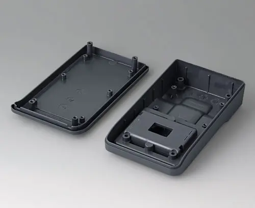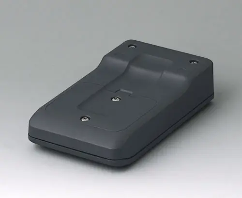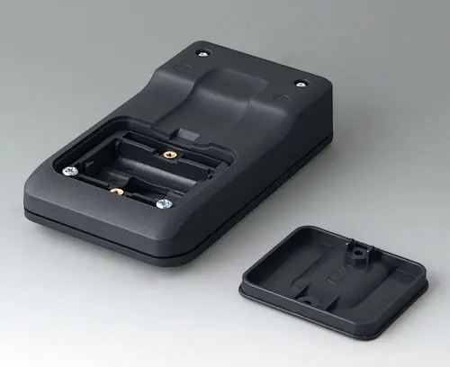 3-part compact hand-held enclosure with an ergonomic, robust design. Ideal for miniaturised electronics applications. Secure grip through finger recess in the bottom part and centre of gravity near the body. With a battery compartment, accessible from the outside, for 3 x 1.5 V AAA batteries. Recessed user area to protect the operating elements. Attachment domes for PCBs and components in the top and bottom parts.