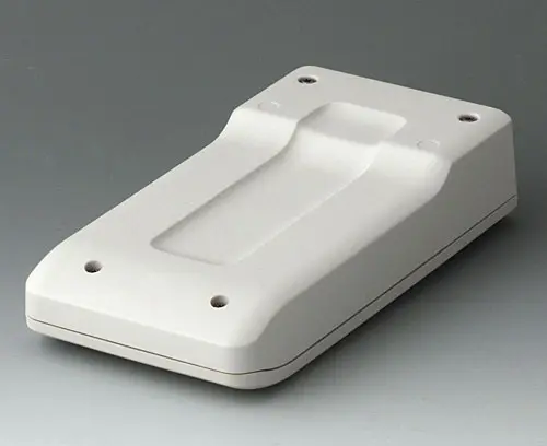 2-part compact hand-held enclosure with sealing and with an ergonomic, robust design. Secure grip through finger recess in the bottom part. Recessed user area to protect the operating elements. Attachment domes for PCBs and components in the top and bottom parts.