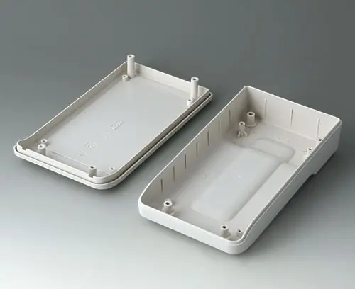 2-part compact hand-held enclosure with an ergonomic, robust design. Secure grip through finger recess in the bottom part. Recessed user area to protect the operating elements. Attachment domes for PCBs and components in the top and bottom parts.