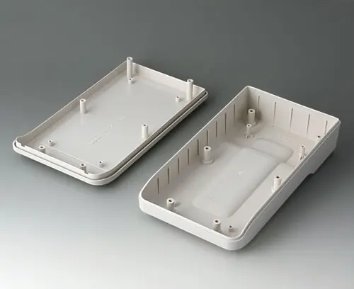2-part compact hand-held enclosure with an ergonomic, robust design. Secure grip through finger recess in the bottom part. Recessed user area to protect the operating elements. Attachment domes for PCBs and components in the top and bottom parts.