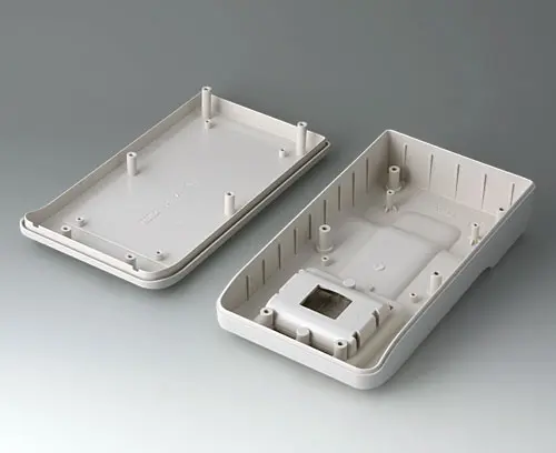 3-part compact hand-held enclosure with an ergonomic, robust design. Ideal for miniaturised electronics applications. Secure grip through finger recess in the bottom part and centre of gravity near the body. With a battery compartment, accessible from the outside, for 3 x 1.5 V AA batteries. Recessed user area to protect the operating elements. Attachment domes for PCBs and components in the top and bottom parts.