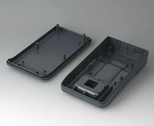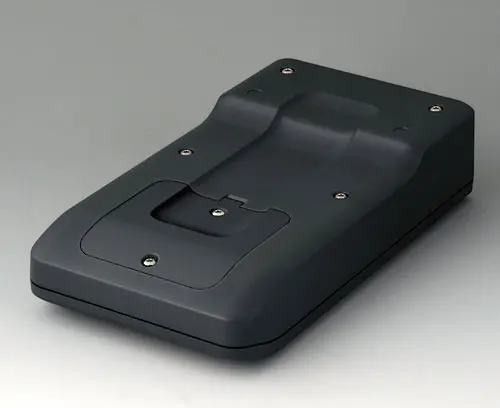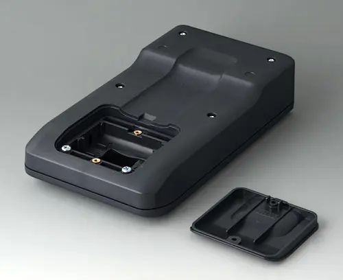 3-part compact hand-held enclosure with an ergonomic, robust design. Ideal for miniaturised electronics applications. Secure grip through finger recess in the bottom part and centre of gravity near the body. With a battery compartment, accessible from the outside, for 3 x 1.5 V AA batteries. Recessed user area to protect the operating elements. Attachment domes for PCBs and components in the top and bottom parts.