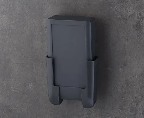 Special holder for DATEC-COMPACT S for the secure storage of wired and wireless mobile devices. With large recess for plug-in connections. The holder is mounted on the wall or on other components with standard screws with head diameters of 5.5 to 7 mm.