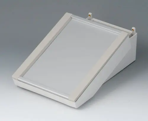 DATEC-TERMINAL M, Vers. I Basic case with terminal compartment. Ergonomically inclined operating area can be used with front panel, profile plate or cover. Suitable to accommodate Eurocards 100 x 160 mm.