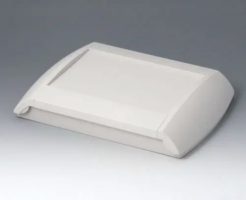 Four-part case. The bottom part can be fixed directly to the wall, the top part will be assembled by means of screws from the front. 2 side trims close the case. If required, the trims can also be locked, thus preventing unauthorised access. Recessed operating area to protect the membrane keyboard. Fastening pillars for PCBs in bottom and top part. Integrated supports for 2 x AA / 1 x 9 V.