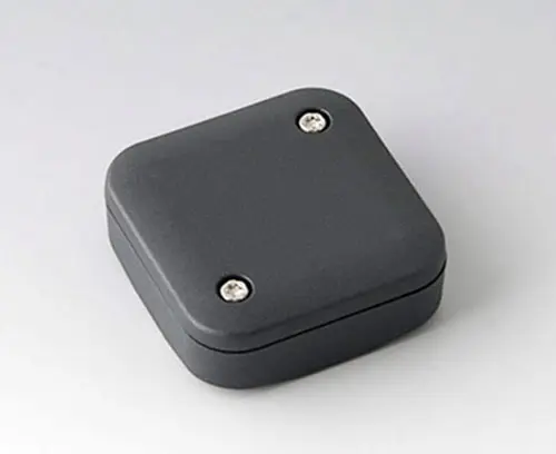 2-part plastic enclosure with flat top part, for universal use. Robust design with proven tongue and groove connection. Assembled with Torx stainless steel screws. Fixing supports for PCBs and components in the top and bottom parts. Fastening on the supports is by means of hot caulking.