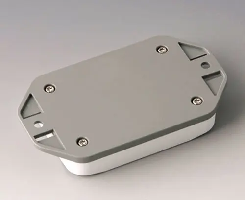 2-part plastic enclosure with flat top part. Bottom part with integrated flanges for fast wall mounting or for mounting on rails and tube profiles or on masts. Robust design with proven tongue and groove connection. Assembled with Torx stainless steel screws. Fixing supports for PCBs and components in the top and bottom parts. Fastening on the supports is by means of hot caulking.