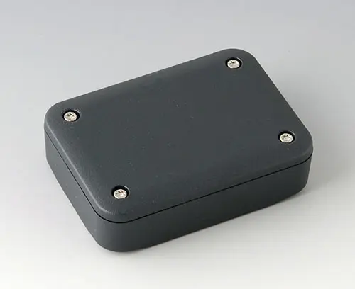 2-part plastic enclosure with high top part, for universal use. Robust design with proven tongue and groove connection. Assembled with Torx stainless steel screws. Fixing supports for PCBs and components in the top and bottom parts. Fastening on the supports is by means of hot caulking.