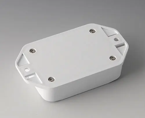 2-part plastic enclosure with high top part. Bottom part with integrated flanges for fast wall mounting or for mounting on rails and tube profiles or on masts. Robust design with proven tongue and groove connection. Assembled with Torx stainless steel screws. Fixing supports for PCBs and components in the top and bottom parts. Fastening on the supports is by means of hot caulking.