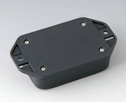 2-part plastic enclosure with high top part. Bottom part with integrated flanges for fast wall mounting or for mounting on rails and tube profiles or on masts. Robust design with proven tongue and groove connection. Assembled with Torx stainless steel screws. Fixing supports for PCBs and components in the top and bottom parts. Fastening on the supports is by means of hot caulking.