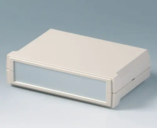 MOTEC S, flat/flat Desk top case with flat base and top part. Screwless mounting of the shells. Front and rear part open. Screw towers for PCBs and vertical guides for mounting panels. Front and rear panels to slide in as accessory.