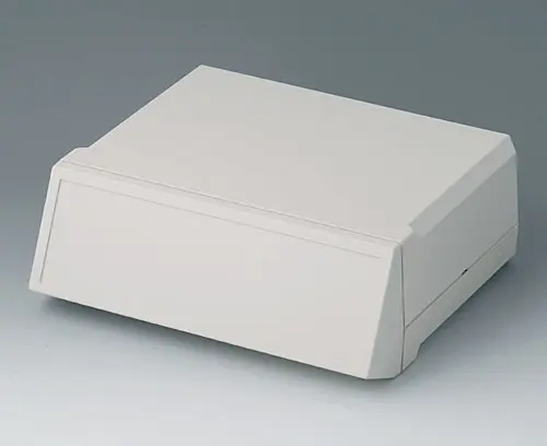 MOTEC L, flat/high Desk top case with flat base and high top part. Screwless mounting of the shells. Front and rear part open. Screw towers for PCBs and vertical guides for mounting panels. Front and rear panels to slide in as accessory.