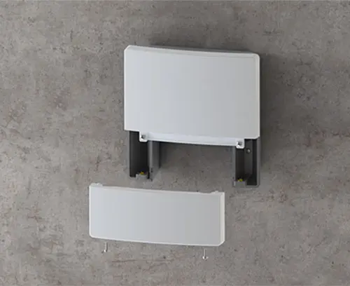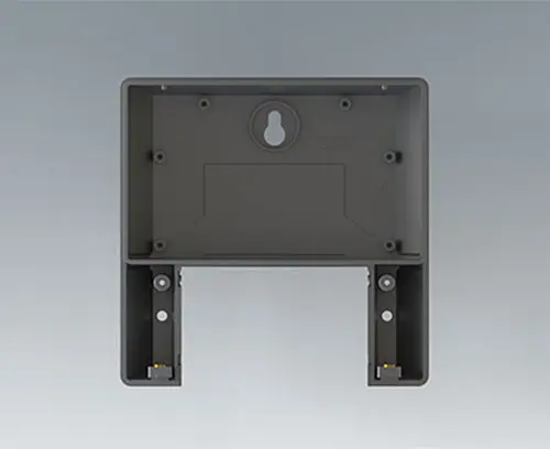 Bottom part with openings for concealed three-point wall mounting: 1 keyhole for central mounting and 2 holes to secure the enclosure on the bottom right and left.