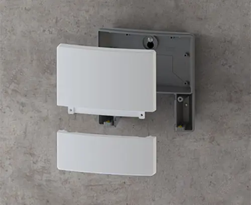 Three-part enclosure with a uniform appearance thanks to concealed screw connections. Modern colour combination of light grey and lava. 2 PCB levels with 4 attachment domes each in the electronics compartment. Can also be used out of doors thanks to the high-quality ASA+PC-FR material.