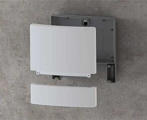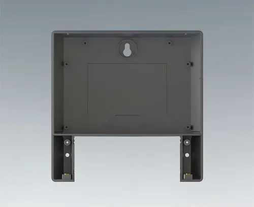 Bottom part with openings for concealed three-point wall mounting: 1 keyhole for central mounting and 2 holes to secure the enclosure on the bottom right and left.