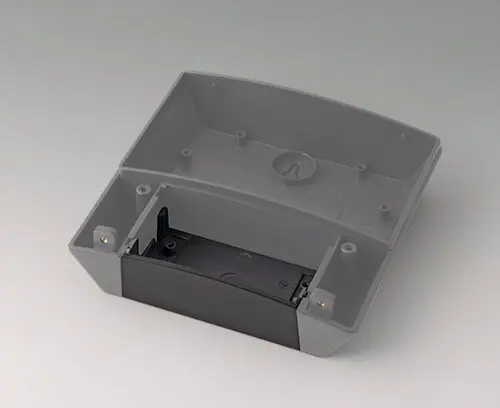 NET-BOX 140, Vers. I Three-part enclosure with a uniform appearance thanks to concealed screw connections. Modern colour combination of light grey and lava. 2 PCB levels with 4 attachment domes each in the electronics compartment. Can also be used out of doors thanks to the high-quality ASA+PC-FR material.