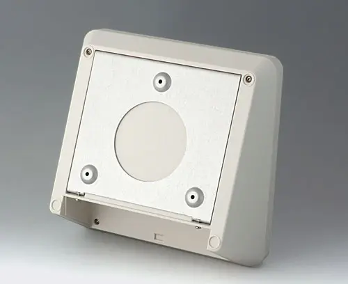 PROTEC 220, Vers. I Modern two piece plastic enclosure with an ergonomically inclined operating panel. Fastening pillars for PCBs and components in the top and bottom parts. Recessed interface area. Wall suspension element and sealing (to raise the protection class up to IP 65) included in the range of accessories. Hidden stainless steel assembly screws with secure Torx heads. Can also be used outdoors thanks to the high-quality material and the robust design.