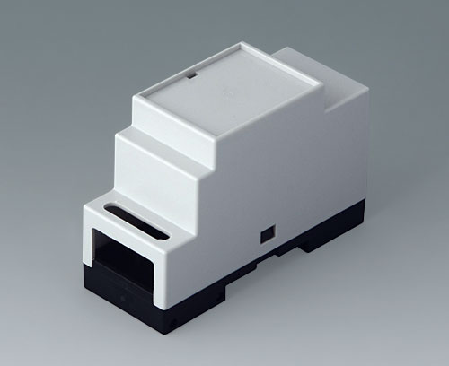 Enclosure for applications where larger components/assemblies need to be fitted inside. Different connection levels flat or high for individual configuration. Case corresponds to DIN 43880, size 1. Simple and quick assembly by locking onto DIN-rails EN 60715 TH35. Base part with fixing pillars for the PCB. Vertical and horizontal guides for additional PCBs.