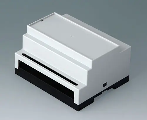 Enclosure for applications where larger components/assemblies need to be fitted inside. Different connection levels flat or high for individual configuration. Case corresponds to DIN 43880, size 1. Simple and quick assembly by locking onto DIN-rails EN 60715 TH35. Base part with fixing pillars for the PCB. Vertical and horizontal guides for additional PCBs.