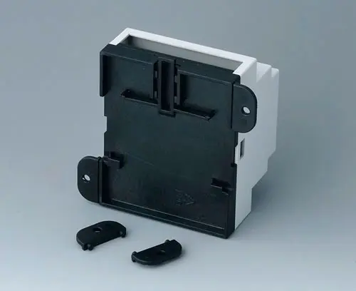 RAILTEC B, 2 modules, Vers. IV Case corresponds to DIN 43880, size 1. Simple and quick assembly by locking onto DIN-rails EN 60715 TH35. Base part with fixing towers. Top part with ventilation slots. Vertical and horizontal guides for additional PCBs.