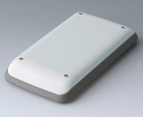 3-piece handheld enclosure with TPE intermediate ring, compact design, with a large operating panel of up to 4" (10 cm). Comfortable grip thanks to enclosure contours that are rounded along the sides and intermediate ring made of TPE, which also serves as impact protection and as a sealing ring for protection class IP 54. Flat operating panel for individual design and arrangement of operating and display elements of all kinds. Fastening pillars for mounting PCBs in top and bottom parts.