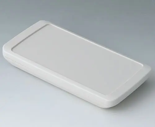 2-piece handheld enclosure, flat design, with a large operating panel of up to 4" (10 cm). The contours of the enclosure are rounded along the sides - comfortable to hold and easy to operate. Recessed operating panel for using a contoured transparent front screen (available as an accessory with adhesive film) or for protecting individual membrane keyboards. Fastening pillars for mounting PCBs in top and bottom parts. Seal for protection class IP 65 available as accessory.