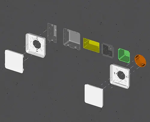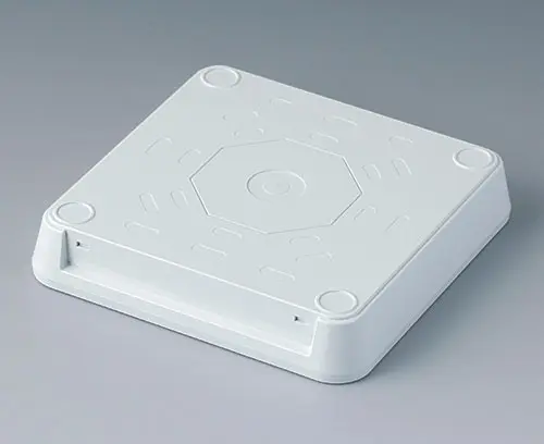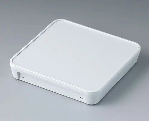 Elegant two-part plastic enclosure with flat top part. Fastening pillars for PCBs and components in the top part. Bottom part with a series of pre-moulded cut-outs for assembly on standard flush-mounted/cavity wall boxes (machining required). Secure snap-in assembly of top and bottom parts. Rational assembly of the electronics. To open the enclosures easily and practically, we recommend that you use the opening tool set, which is available as an accessory. Recessed operating area protects a membrane keyboard or glass control panel. Due to the high-quality material (UL 94 V-0) and the elegant design, perfect for use in modern building services technology.