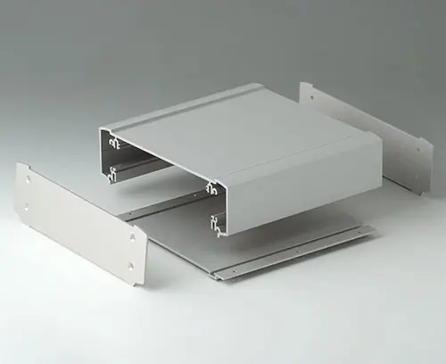 Horizontal guides and screw channels provided inside the case for fitting PCBs. Flat areas for easy installation of interfaces. Recessed area in the top for the protection of displays, membrane keypads and operating elements.