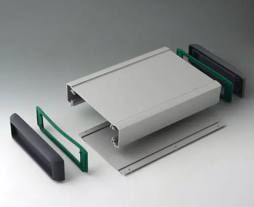 Horizontal guides and screw channels provided inside the case for fitting PCBs. Flat areas for easy installation of interfaces. Recessed area in the top for the protection of displays, membrane keypads and operating elements. Side covers with recessed area for protecting cables and connectors.