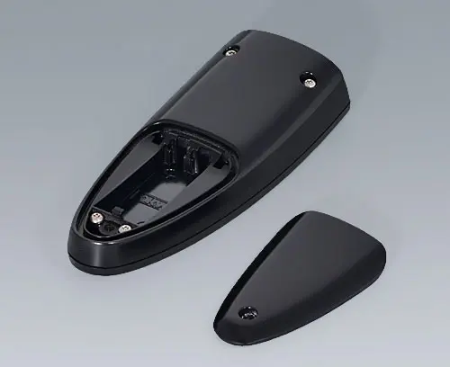 Three-piece hand-held enclosure with an ergonomic, robust design and a pleasant touch sensation. Offers protection up to IP 65 with sealing kit (accessory). Protection class IP 40 without sealing kit. Attachment pillars for PCBs and components in the top and bottom parts.