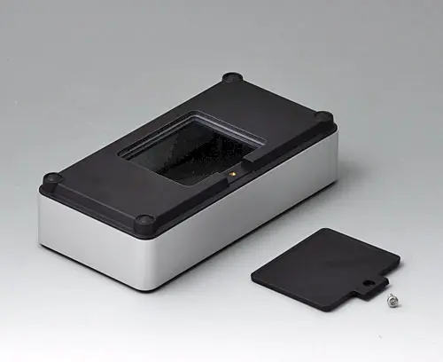 4-part enclosure for many different applications. Sturdy frame made of aluminium, glass bead-blasted and anodised. Plastic parts made of ASA+PC-FR with good UV resistance and high flame resistance. Attachment domes for PCBs and components in the top and bottom parts. Top part with recessed surface to protect the membrane keyboard. Bottom part with opening and screw-down cover: practical for the use of a battery compartment or for access to the interior, e.g. for a memory card or batteries that are mounted directly on the PCB. Battery compartment kit 3 x AA with contact springs, battery clips, button cell holder and wall mounting option as accessories.