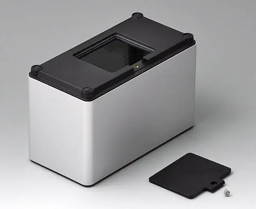 4-part enclosure for many different applications. Sturdy frame made of aluminium, glass bead-blasted and anodised. Plastic parts made of ASA+PC-FR with good UV resistance and high flame resistance. Attachment domes for PCBs and components in the top and bottom parts. Top part with recessed surface to protect the membrane keyboard. Bottom part with opening and screw-down cover: practical for the use of a battery compartment or for access to the interior, e.g. for a memory card or batteries that are mounted directly on the PCB. Battery compartment kit 3 x AA with contact springs, battery clips, button cell holder and wall mounting option as accessories.