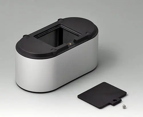 4-part enclosure for many different applications. Sturdy frame made of aluminium, glass bead-blasted and anodised. Plastic parts made of ASA+PC-FR with high UV protection and high flame resistance. Attachment domes for PCBs and components in the top and bottom parts. Top part with recessed surface to protect the membrane keyboard. Bottom part with opening and screw-down cover: practical for the use of a battery compartment or for access to the interior, e.g. for a memory card or batteries that are mounted directly on the PCB. Battery compartment kit 3 x AA with contact springs, battery clips, button cell holder and wall mounting option as accessories.