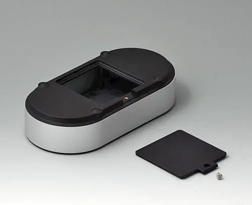 4-part enclosure for many different applications. Sturdy frame made of aluminium, glass bead-blasted and anodised. Plastic parts made of ASA+PC-FR with high UV protection and high flame resistance. Attachment domes for PCBs and components in the top and bottom parts. Top part with recessed surface to protect the membrane keyboard. Bottom part with opening and screw-down cover: practical for the use of a battery compartment or for access to the interior, e.g. for a memory card or batteries that are mounted directly on the PCB. Battery compartment kit 4 x AA with contact springs, battery clips, button cell holder and wall mounting option as accessories.