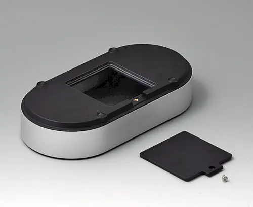 4-part enclosure for many different applications. Sturdy frame made of aluminium, glass bead-blasted and anodised. Plastic parts made of ASA+PC-FR with high UV protection and high flame resistance. Attachment domes for PCBs and components in the top and bottom parts. Top part with recessed surface to protect the membrane keyboard. Bottom part with opening and screw-down cover: practical for the use of a battery compartment or for access to the interior, e.g. for a memory card or batteries that are mounted directly on the PCB. Battery compartment kit 4 x AA with contact springs, battery clips, button cell holder and wall mounting option as accessories.