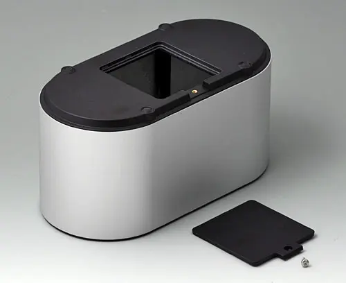 4-part enclosure for many different applications. Sturdy frame made of aluminium, glass bead-blasted and anodised. Plastic parts made of ASA+PC-FR with high UV protection and high flame resistance. Attachment domes for PCBs and components in the top and bottom parts. Top part with recessed surface to protect the membrane keyboard. Bottom part with opening and screw-down cover: practical for the use of a battery compartment or for access to the interior, e.g. for a memory card or batteries that are mounted directly on the PCB. Battery compartment kit 4 x AA with contact springs, battery clips, button cell holder and wall mounting option as accessories.