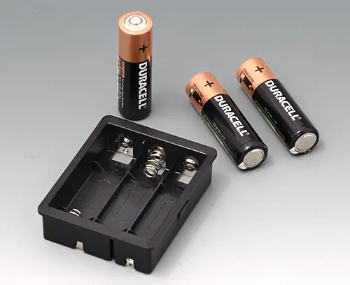 For 3 x 1.5 V mignon-cells (AA). To install a PCB above the battery compartment in the bottom part, the extender (EZ031209) is required.