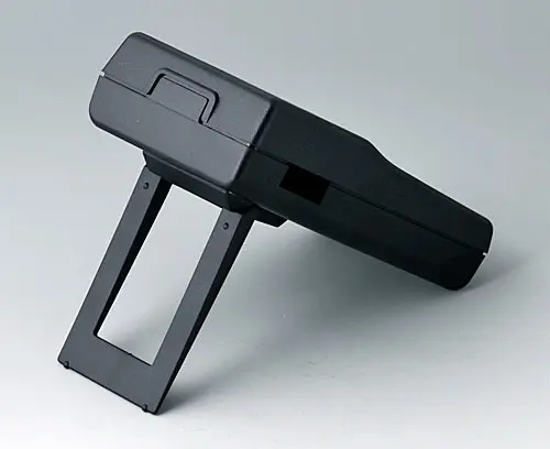 HAND-HELD-BOX P, Vers. I Successfully used case for measuring instruments. With recessed area for imprintings or your logo. Cut-out section for LCD or analogical modules. With battery compartment, accessible from the outside, for 9 V flat battery (PP3) or 1.5 V baby cell (C) with contacts for soldering. Raised front area to accommodate plugs.
